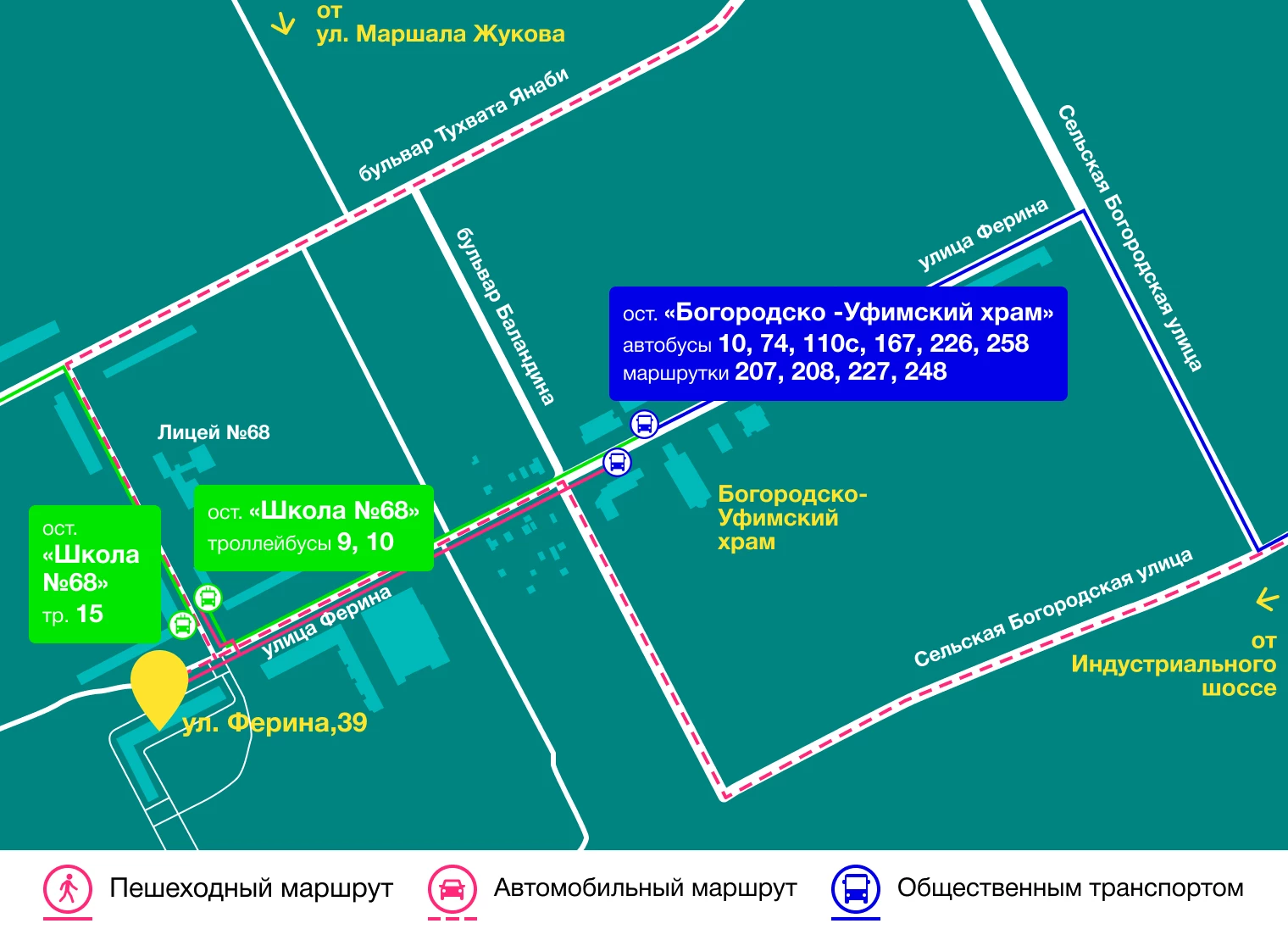 Ближайшая автобусная остановка – «Богородско-Уфимский храм», через нее следуют автобусы № 10, 74, 110с, 167, 226 и 258, маршрутки № 207, 208, 227 и 248. Если вы вышли из общественного транспорта на стороне храма, то пройдите против направления движения транспорта вдоль улицы Ферина примерно 700 метров. Впереди слева увидите многоэтажный дом с магазином «Пятерочка» на первом этаже. В этом доме находится клиника МЕДСИ-Промедицина. Вход расположен со стороны главного фасада дома, под вывеской. Если вы вышли из общественного транспорта напротив храма, перейдите дорогу и следуйте маршрутом, описанным выше.